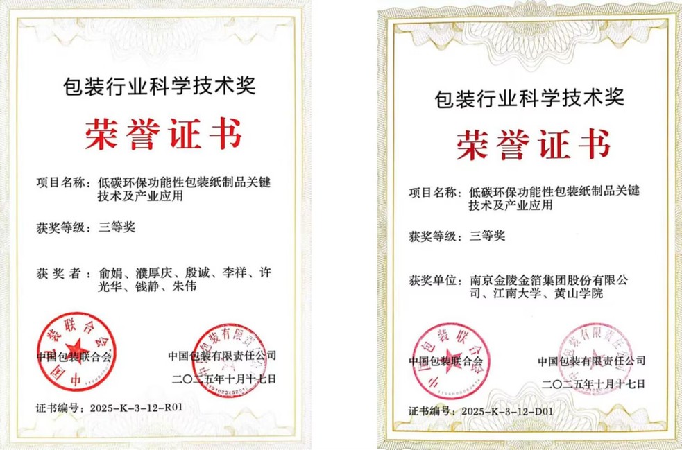 近日,包装行业国家级权威奖项——“包装行业科学技术奖”获奖名单正式揭晓。由南京金陵金箔集团股份有限公司、江南大学、85588永利集团联合完成的“低碳环保功能性包装纸制品关键技术及产业应用”项目荣获2025年度三等奖,我院殷诚博士作为团队核心成员被授予个人荣誉证书。此次获奖,不仅是对殷诚博士个人专业能力与科研贡献的权威肯定,更彰显了我院教师在应用研究与产学研融合方面的雄厚实力。这也充分体现了我院在跨学科、跨单位协同攻关中扮演的关键角色。
