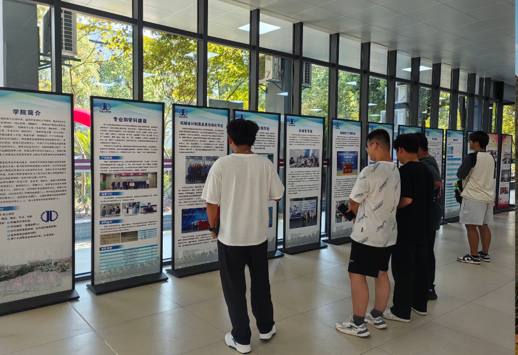 文津楼一楼“辉煌历程,创新未来”主题展厅,成为新生及家长们全面了解yl88858永利集团的第一站。精心制作十余个展架,详细展示了学院专业结构、课程设置、师资力量、教学设施、学科竞赛及科研成果,从安徽省优秀科研创新团队到安徽省示范实验实训中心,从机械工业科学技术奖科技进步奖三等奖到安徽省优秀科研创新团队,每一项荣誉都是对学院教学质量和科研能力的充分体现,新生及家长们纷纷驻足观看,充分激发了新生们对专业学习的兴趣。