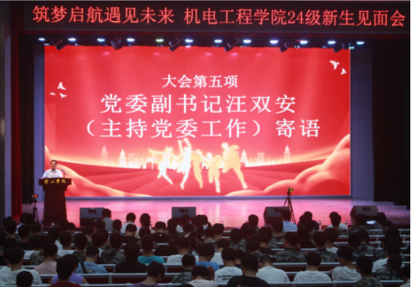 党委副书记(主持党委工作)汪双安寄语新生要追逐梦想,不负韶华,并对新生提出了四点期望:一是要志存高远,树立正确目标方向;二是要勤勉笃行,练就过硬本领,三是要迎难而上,磨炼坚强意志;四是要强健体魄、培育健康人格。他希望同学们秉承“教人求真、学做真人”的校训,发扬“精益、敬业、专注、创新”的学院精神,踔厉奋发,接力前行,在努力拼搏和不懈奋斗中创造更加美好的人生。